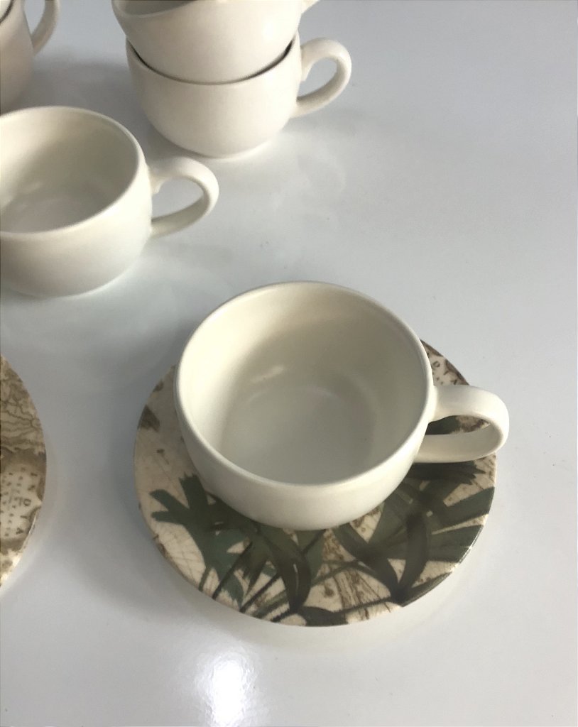 Xícaras para café em cerâmica off white, verniz fosco, Pires  com estampa de folhagens. Cerâmica feldspática de alta resistência. Produto não refratário. Podem ocorrer pequenas variações de tonalidades de cor, brilho, textura e tamanho das peças, em função de fatores relacionados ao processo de transformação de matérias naturais e variações nas etapas de conformação, decoração e queima.